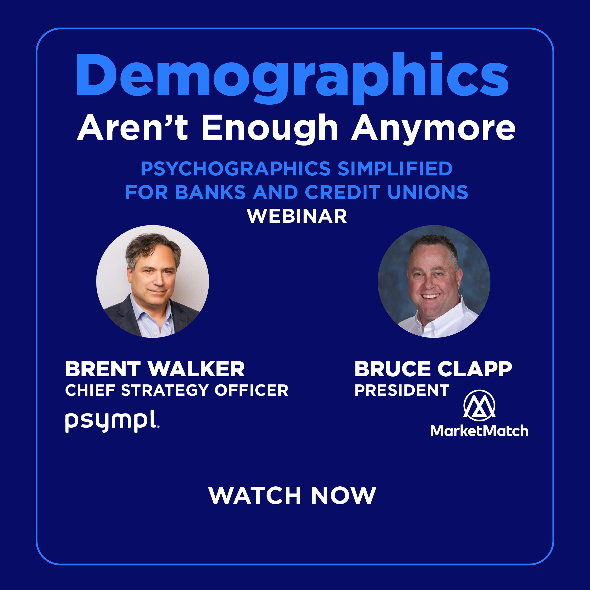 Psympl® Resources Psychographic AI™ Psympl® FAQs Psympl® Answers Blog Psympl® Demo Video Psympl® Webinars Banks and Credit Unions Demographics Aren’t Enough AnymoreMarketMatch + Psympl Psympl® Guides Banks and Credit Unions Wealth Management Psympl® Whitepapers Psympl® Information Sheets Psympl® Fact Sheet Psymplifier™ Product Sheet Psychographics Info Sheet Syndicated Data Sets Psympl® Media PSYMPL® PRESS Download Psympl® Media Kit